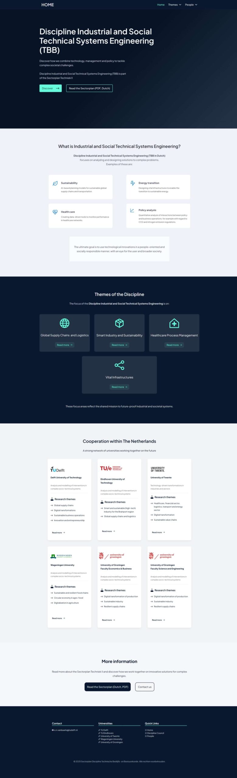 Nederlandse universiteiten (TU Delft, TU Eindhoven, University of Twente, Wageningen University en University of Groningen) werkten geïsoleerd aan complexe maatschappelijke uitdagingen zoals klimaatverandering, supply chain resilience en healthcare innovatie. Er ontbrak een centraal platform om multidisciplinair onderzoek te coördineren, expertise te bundelen en gezamenlijke impact te creëren op gebieden als duurzaamheid, energietransitie en digitale transformatie. Wij hebben een geavanceerd onderzoeksplatform ontwikkeld dat onderzoekers, studenten en industrieën verbindt rond vier hoofdthema’s, waardoor multidisciplinaire samenwerking en kennisuitwisseling mogelijk werden gemaakt.